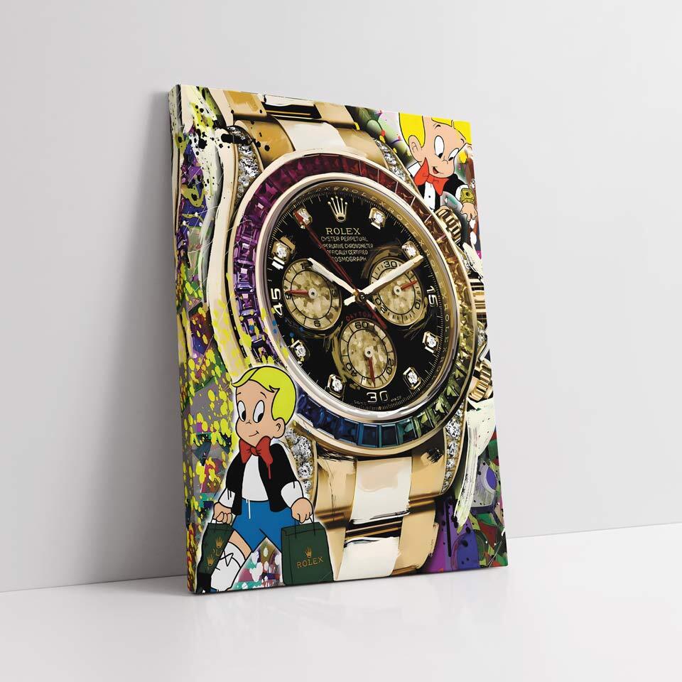 La touche finale vient du petit dessin animé dans le coin inférieur droit de l’image. Il s’agit d’un garçon portant deux sacs, une inclusion surprenante et amusante qui ajoute une note de légèreté à l’image. Cela contraste avec le sérieux et la sophistication de la montre, évoquant une histoire ou une intrigue autour de ce personnage et de son lien avec la Rolex.